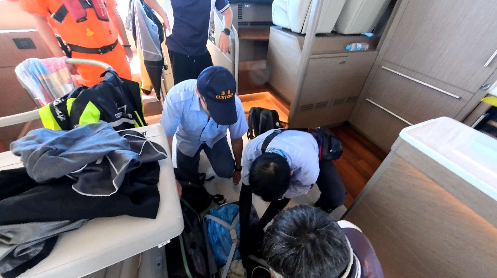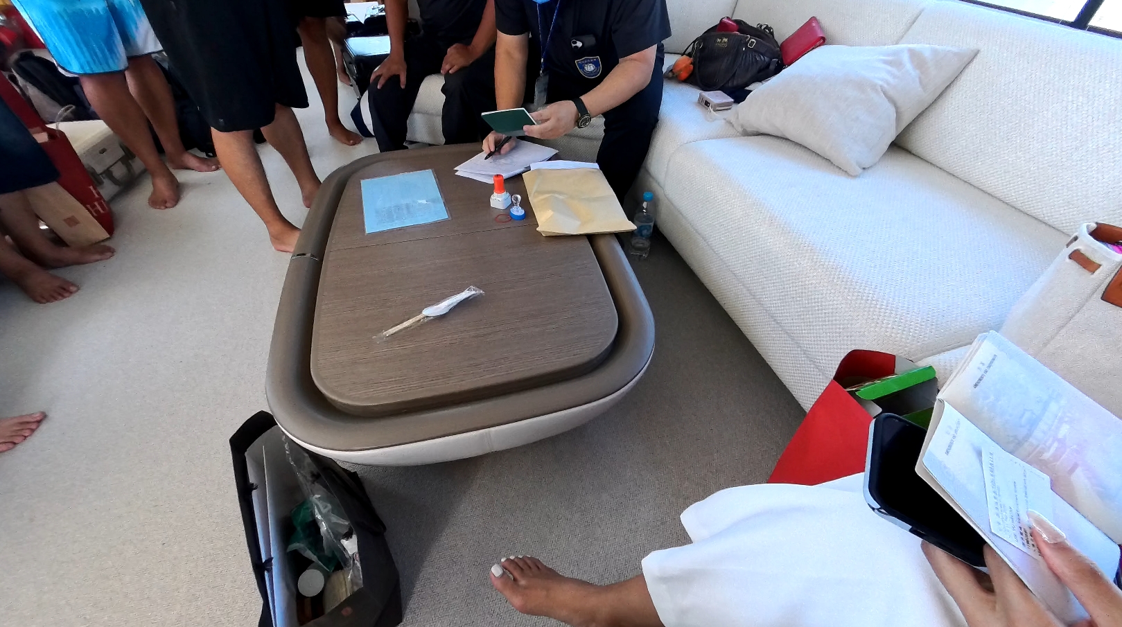 由境外進入的船隻,必須向相關單位申請CIQS,意即海關檢查(Customs)、證照查驗(Immigration)、檢疫(Quarantine) 及安全檢查(Security)四道關卡,我們在船上待了近一小時,等待不同的檢察單位登船,一一檢查護照和仔細翻找行李與船上置物櫃,確保沒有走私及其他非法行為。