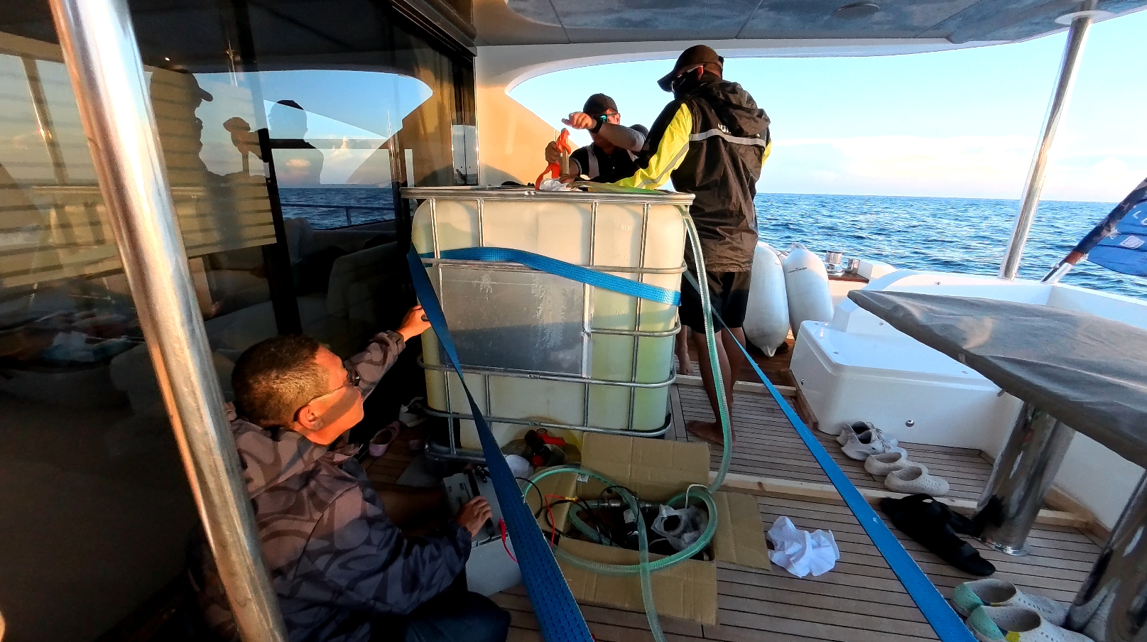 這時在飛橋的船長與水手早已被大雨淋得看不出人形,還得保持航向並注意人員安全,著實非常辛苦。至於隔壁的S66夥伴早在幾小時前就不知去向,透過VHF得知多帶的1000公升油已耗盡,出海後又一路頂浪,必須在順浪的情況下才能為船安全地補給,因此掉頭順浪趕在天黑前加油。