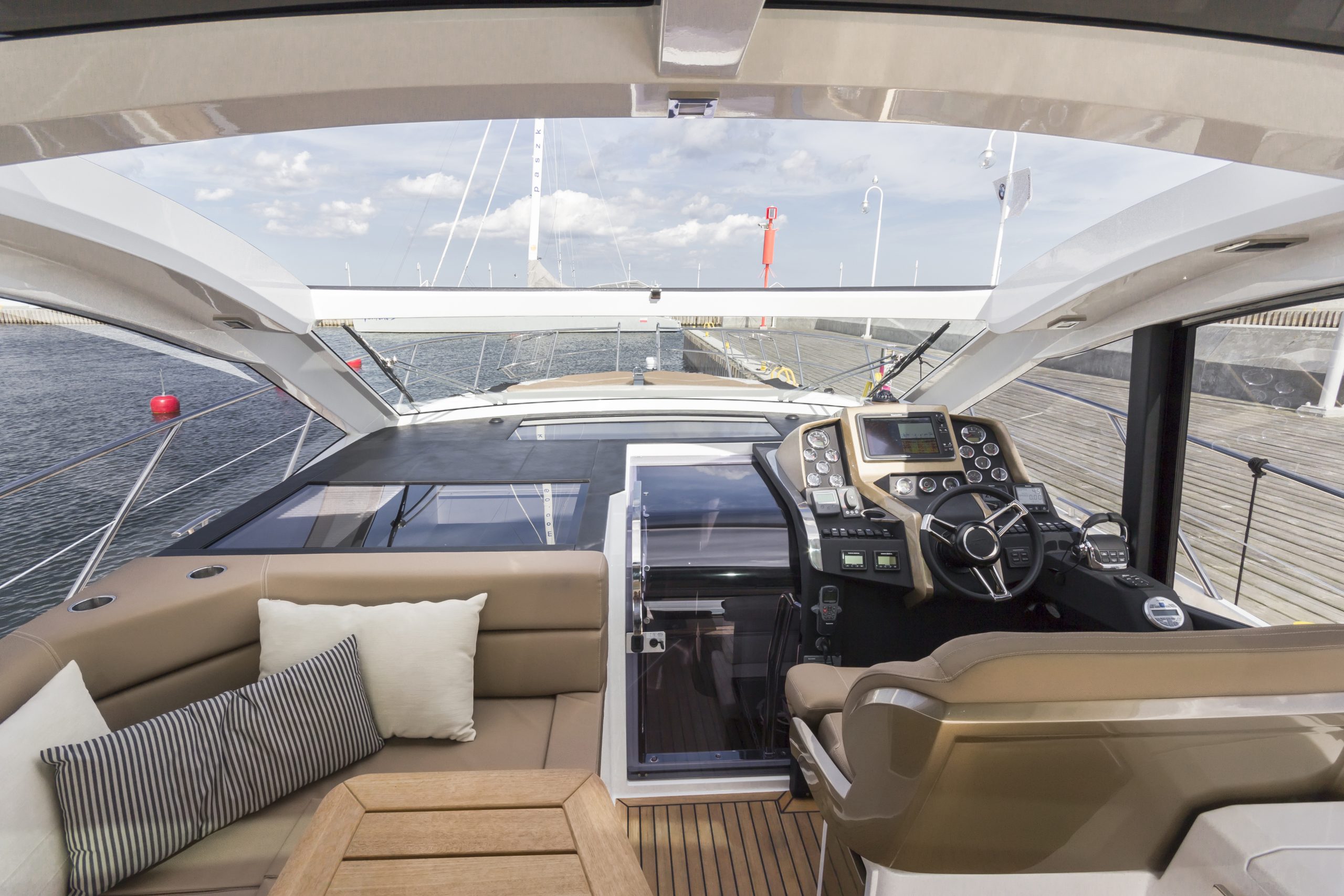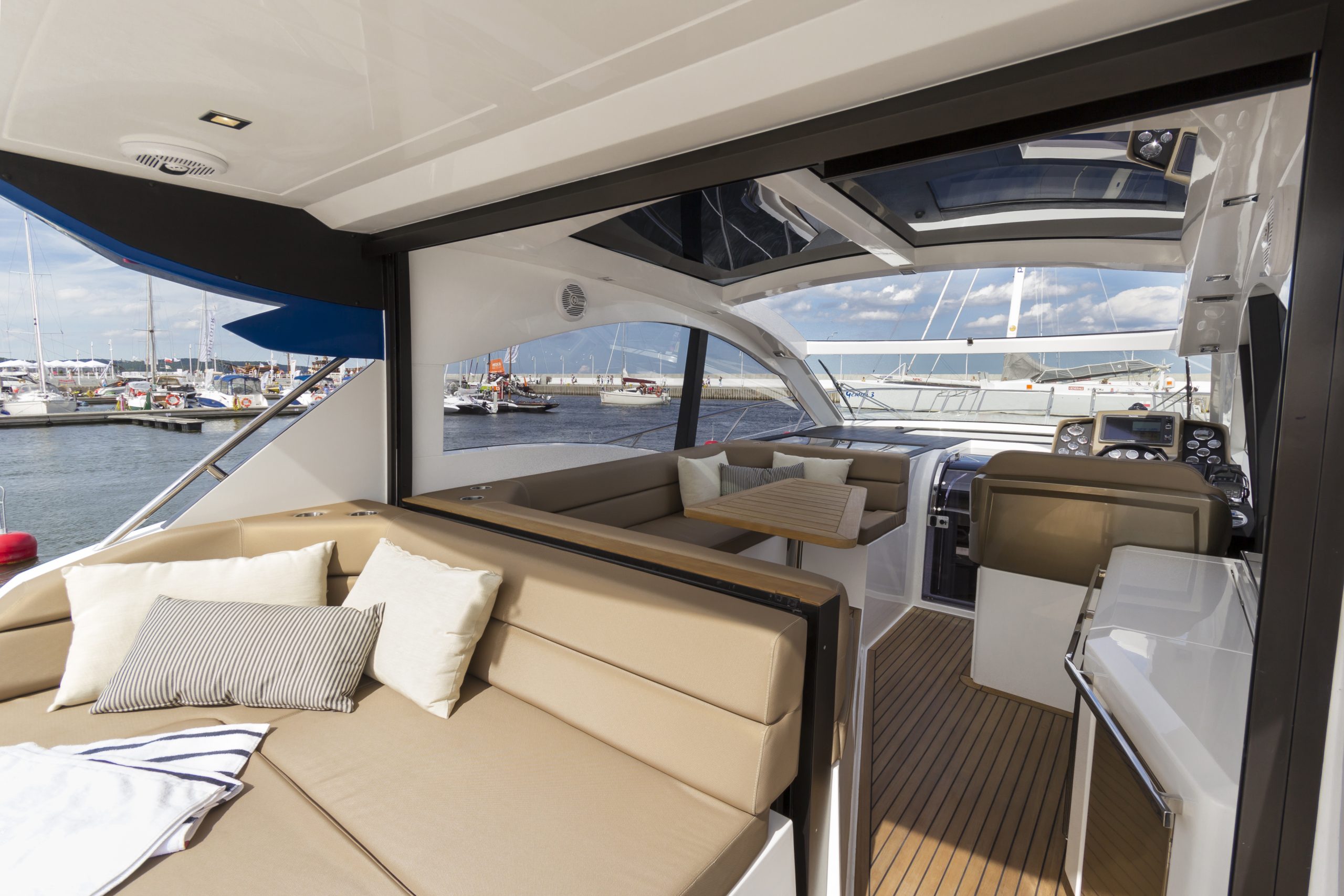 主甲板配置 U 形沙發、吧檯與雙座駕駛台,艙外甲板區域則設有沙發與日光浴區,可透過可伸縮玻璃門與主艙區隔,抵擋風雨。若選擇較小的艇庫,U 形沙發可提供更多賓客休憩空間。寬闊側甲板通向船艏,前方休憩區為乘客提供更多活動空間。