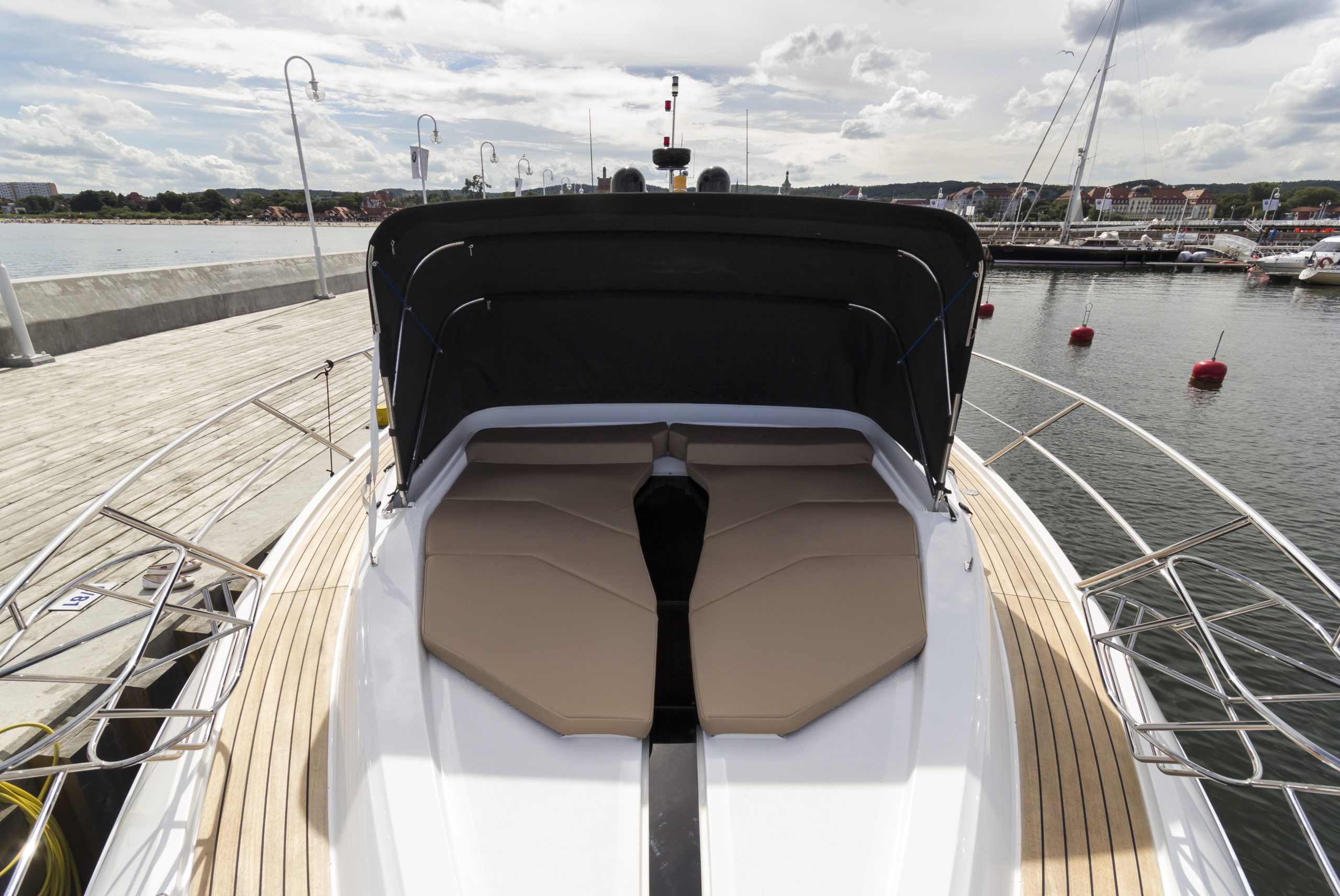 大型液壓艇庫與浴台方便存放個人水上用品,包括小艇與噴射滑水艇。乘客可在船頭休憩區享受遮陽篷保護,日光浴區則可搭配自動遮陽棚系統,提升舒適度。