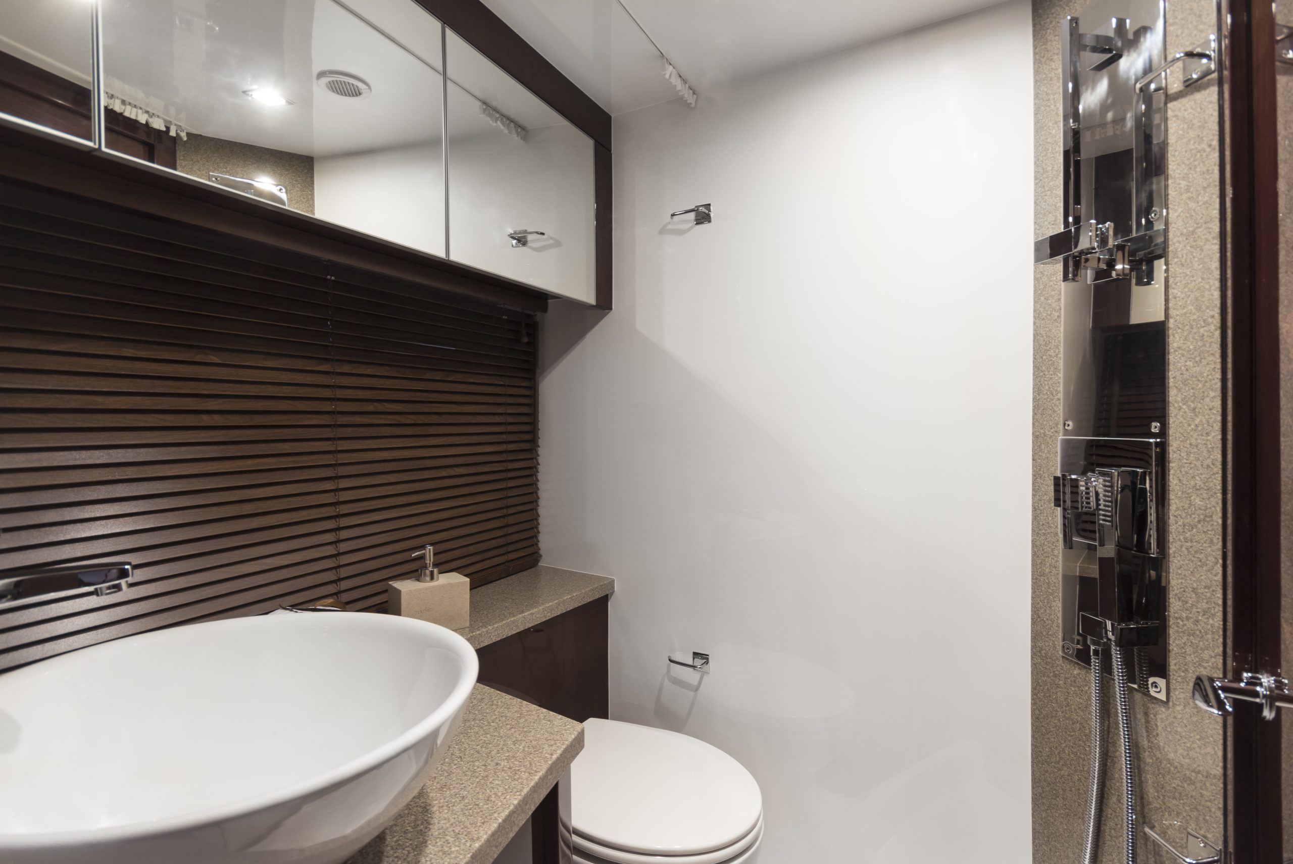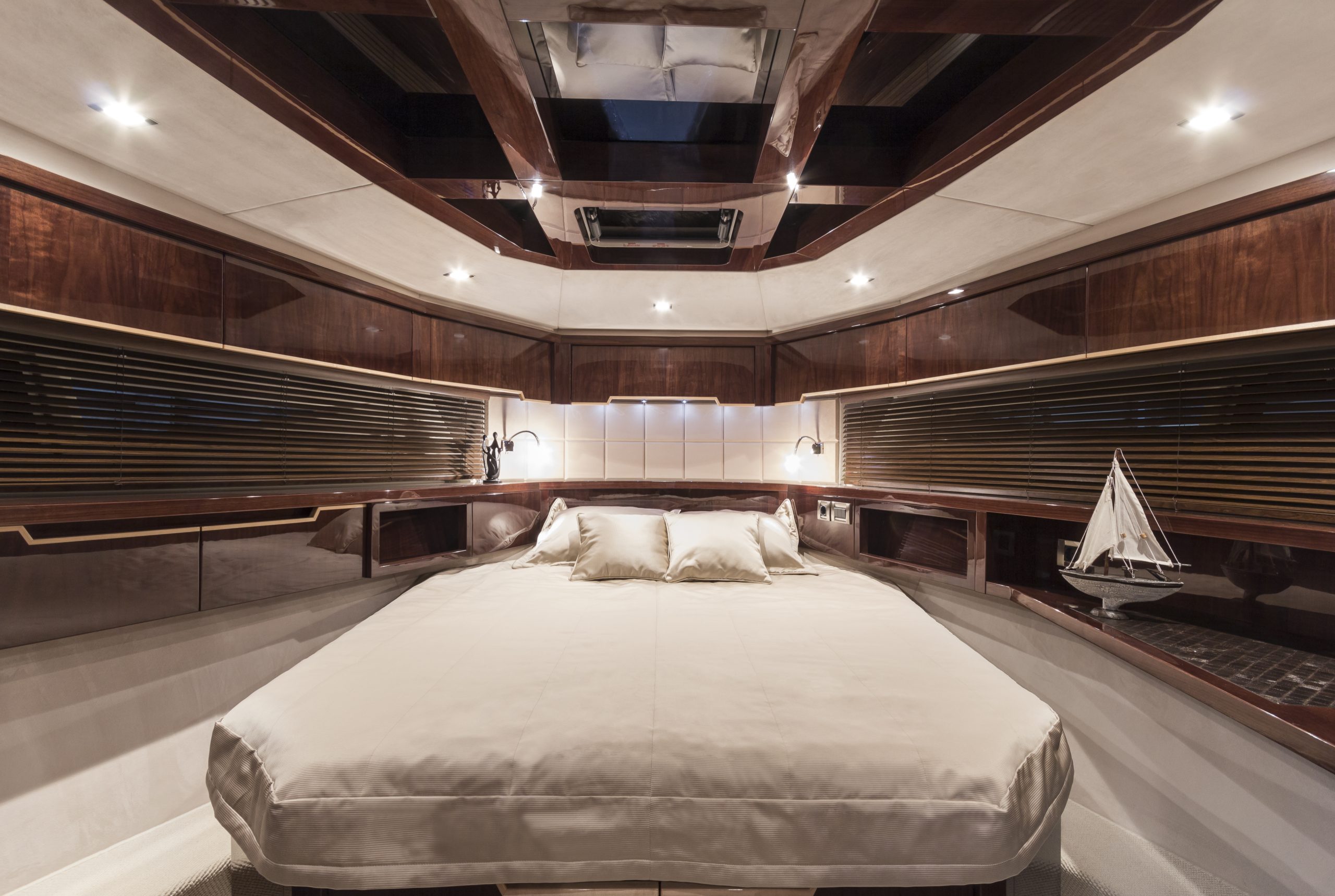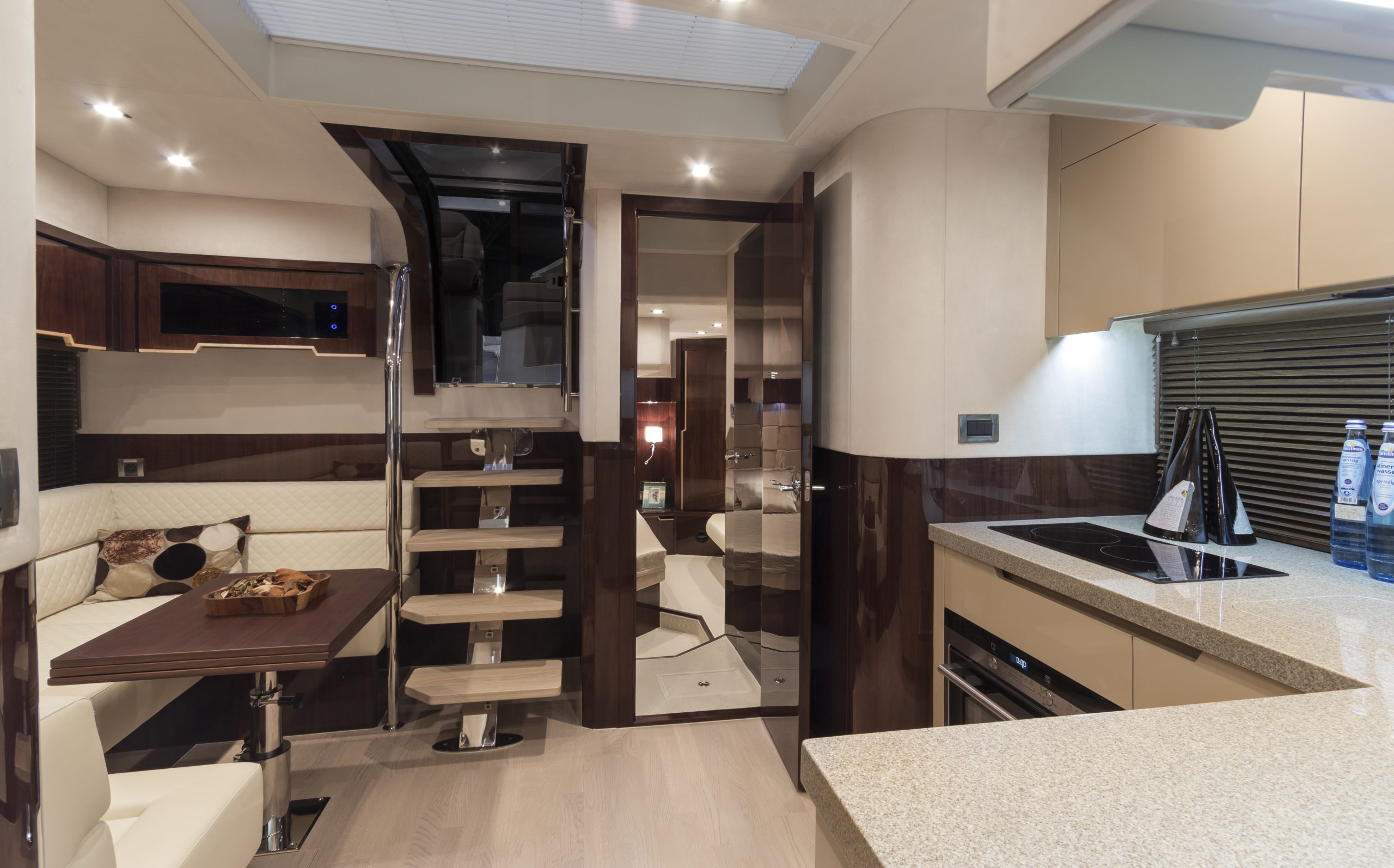 下層艙內光線充足,駕駛艙上方配有大型玻璃天窗,船頭亦設有天窗引入自然光。船中主臥艙配有專屬衛浴,兼顧隱私與舒適;船頭賓客艙可直接通往公共區域,包括廚房、沙龍與第二間浴室,為長途航行提供便利與舒適。