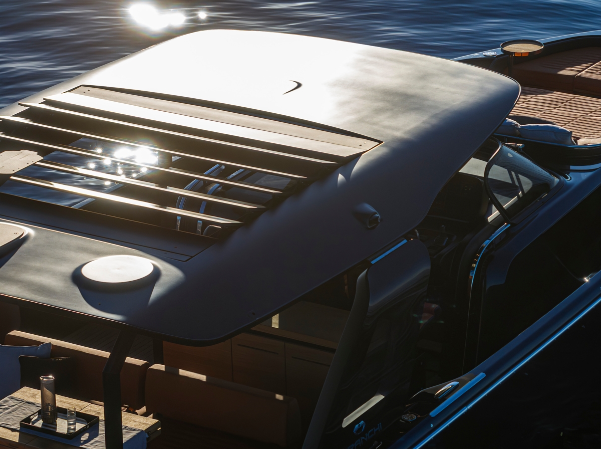 駕駛位置配有環繞式擋風玻璃和 T 型硬頂,這是 A46 Luxury Tender 迷人的地方之一。全寬硬頂以優美的線條和碳纖維組成,深刻體現了這艘遊艇的美學和特徵。高科技材料外殼輕便耐用且含照明和頂級音響系統,讓您在甲板處就能體現最極致的享受。硬頂上的葉片系統可在幾秒鐘內快速閉合,提供通風與光線,創造出獨特的光影效果,與 A46 的精緻風格完美契合。