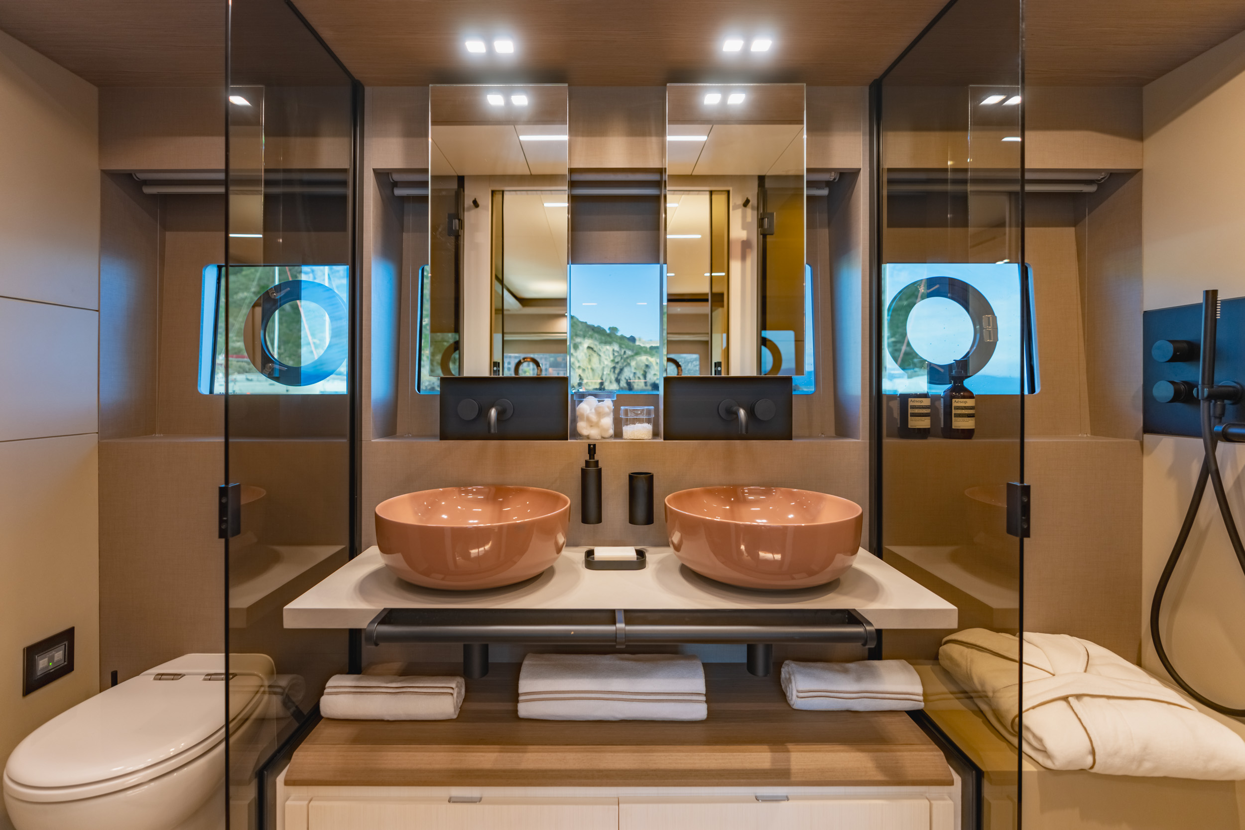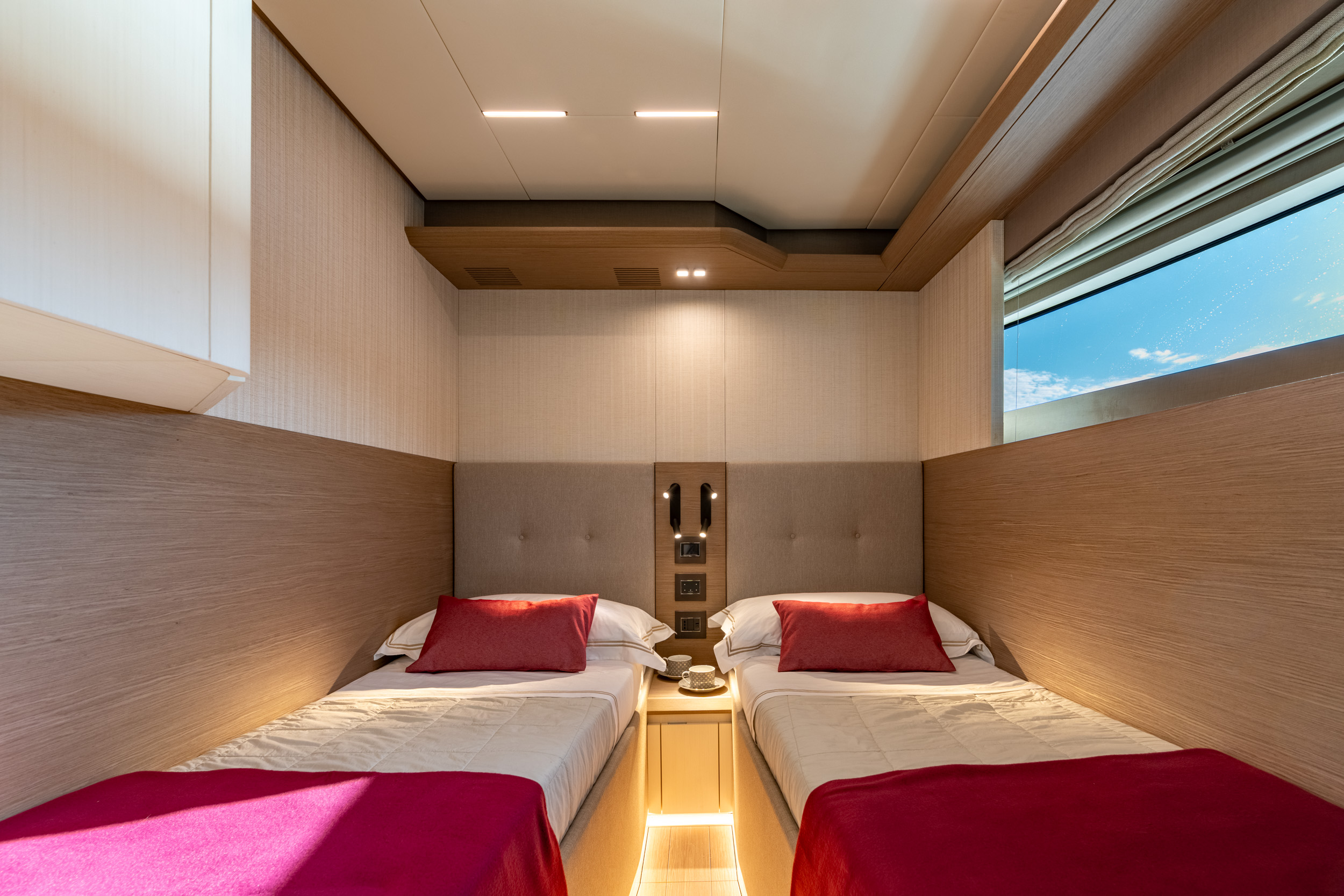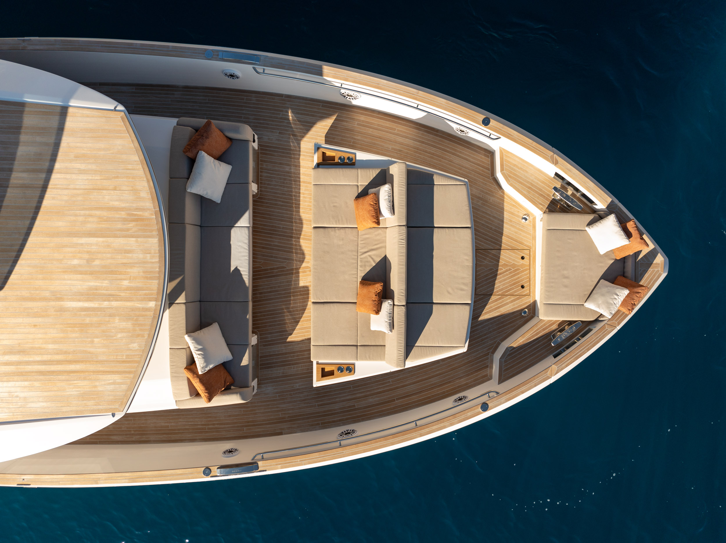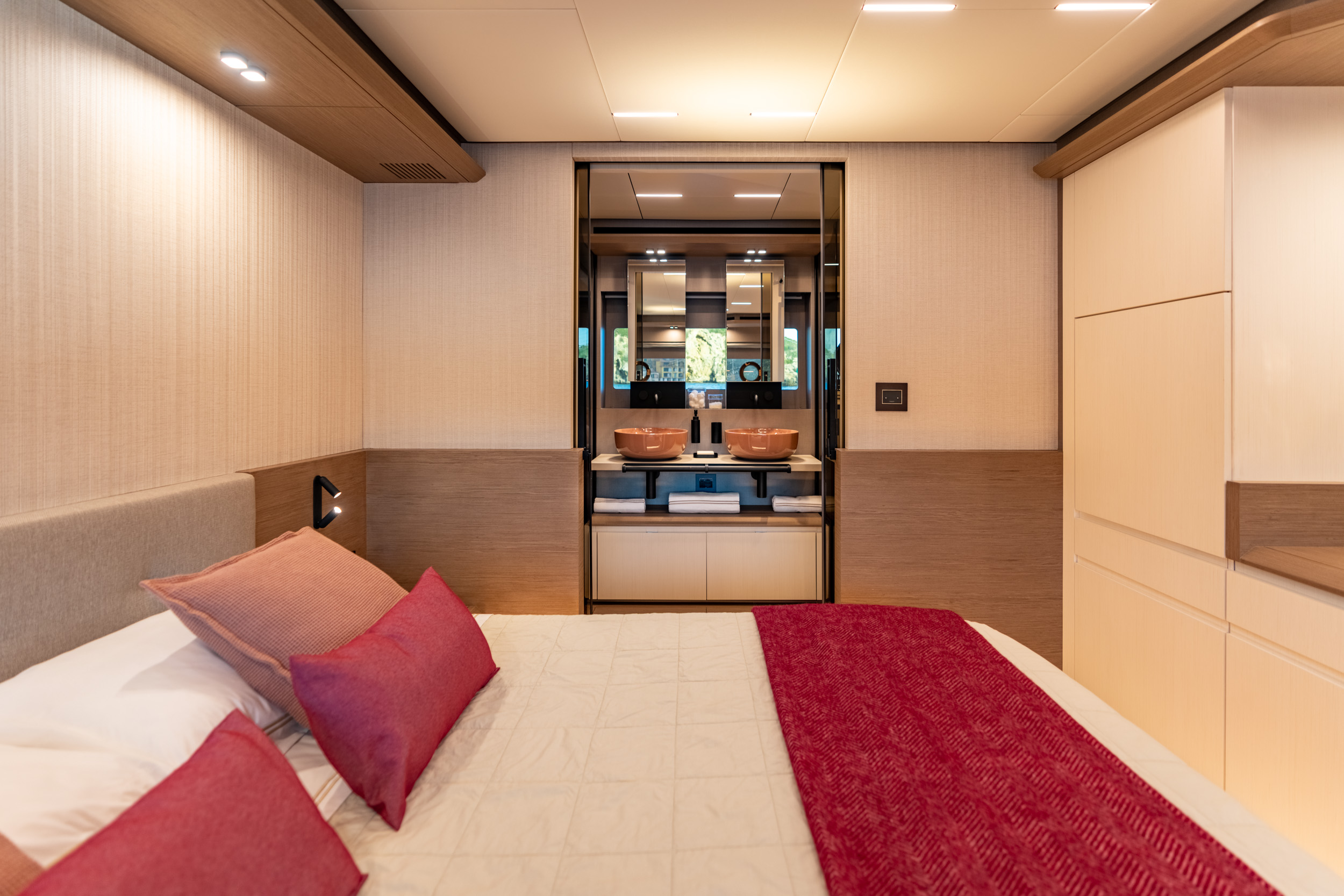 所有空間皆散發低調而細緻的奢華氛圍,並提供高度客製化選項。無論是柚木、胡桃木或橡木,船主皆可依個人喜好選擇內裝飾材,完成屬於自己的材質語彙,讓每一處細節都展現內斂優雅的質感。