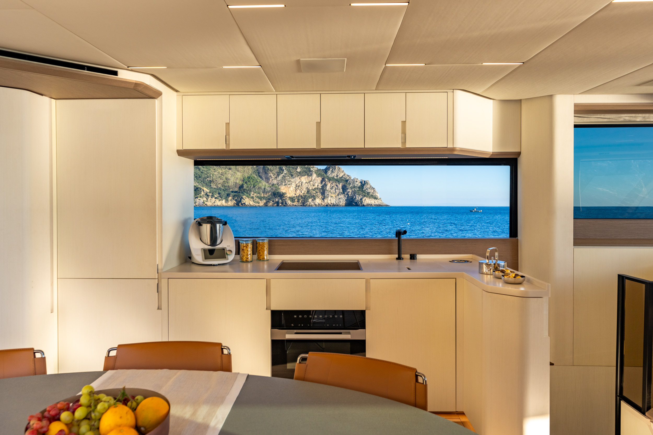E72 的室內配置,專為熱愛長時間巡航、並追求極致舒適與寬敞氛圍的船主而打造,將「可居住性」置於設計核心。主甲板的整體室內空間規劃為明亮開放的格局,船尾為廚房與餐飲區,設有兩扇大型法式落地窗;船首則為舒適的沙龍休憩區。