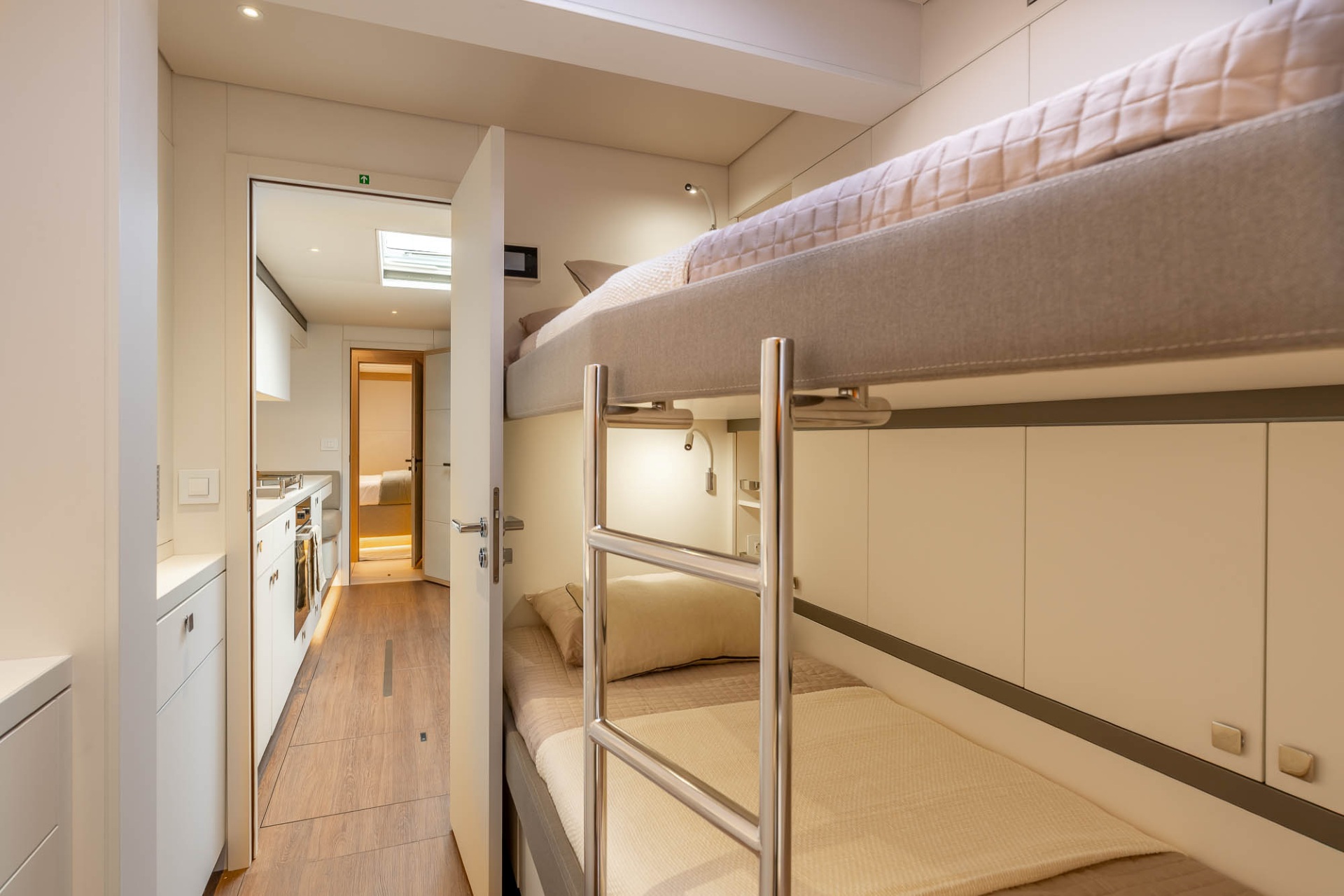 On the interior, the saloon with flush floorboards facilitates movement about the catamaran. Living spaces have been designed to experience life on board naturally, in complete freedom. Turned toward the exterior, the EIGHTY 2 features the design codes of seaside villas, offering a 360° view to admire the horizon.